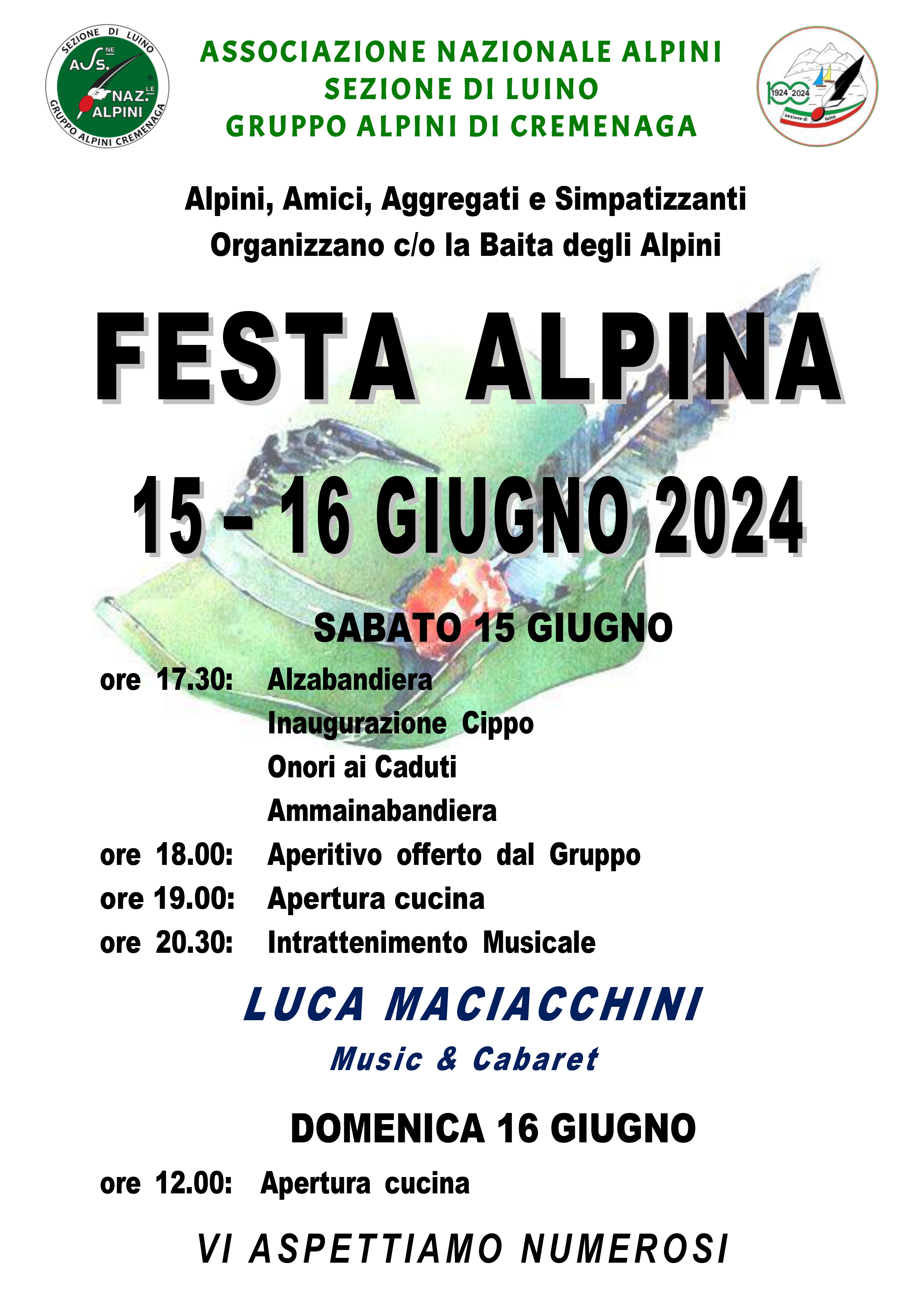 Festa Alpina - Gr. Alpini di Cremenaga 15/16 Giugno 2024 Allegati: Cremenaga Festa Alpina Giugno 2024.jpg[ ]